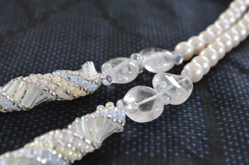 - シードビーズは優しいブルー・イエロー・ピンク、水晶やパールと組み合わせ爽やかな印象です。