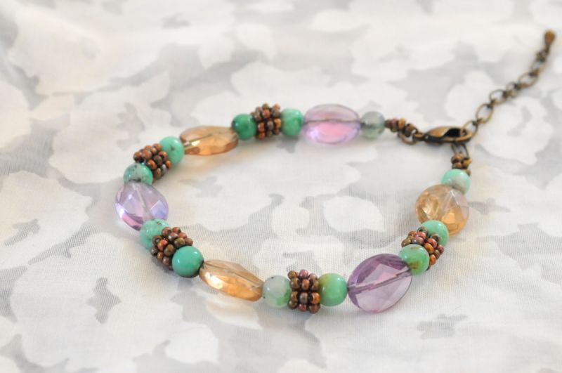 - 天然石の間にシードビーズでコーンを作り、カジュアルなお洋服にも合うブレスレットにしてみました。