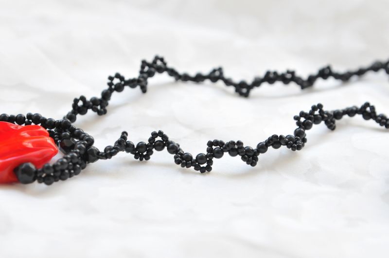 - 楽しい雰囲気なペンダントにしたかったので、ネックレス部分の編み地はくねくねと動きを出してみました。