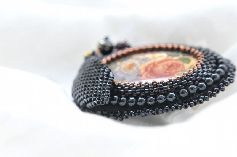 - アンティークパーツをビーズ刺繍の技法でブローチにしてみました。