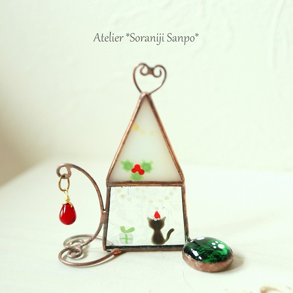 - クリスマスカラーのお家オブジェ。屋根部分は透き通らない白いガラスを使いました。