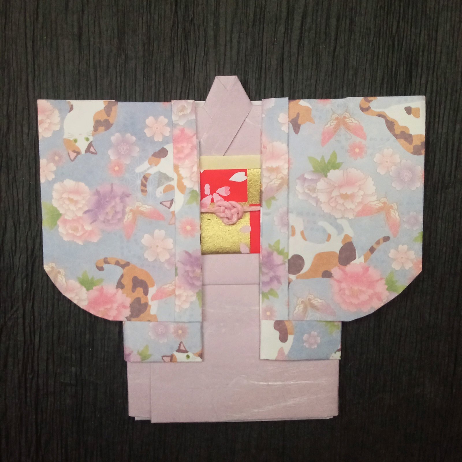 着物の形のポチ袋(半纏)【 牡丹と三毛猫 (水色)】