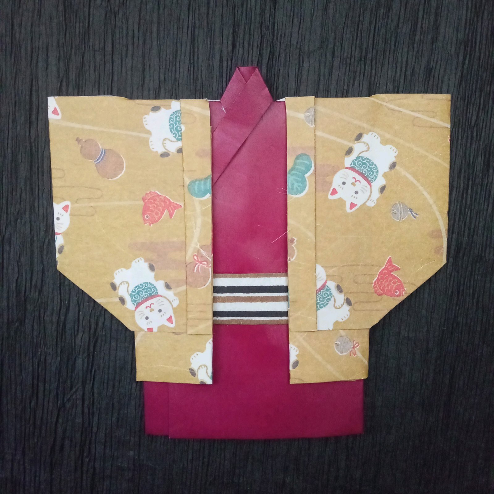 着物の形のポチ袋(半纏)【招き猫 (えんじ色着物)】