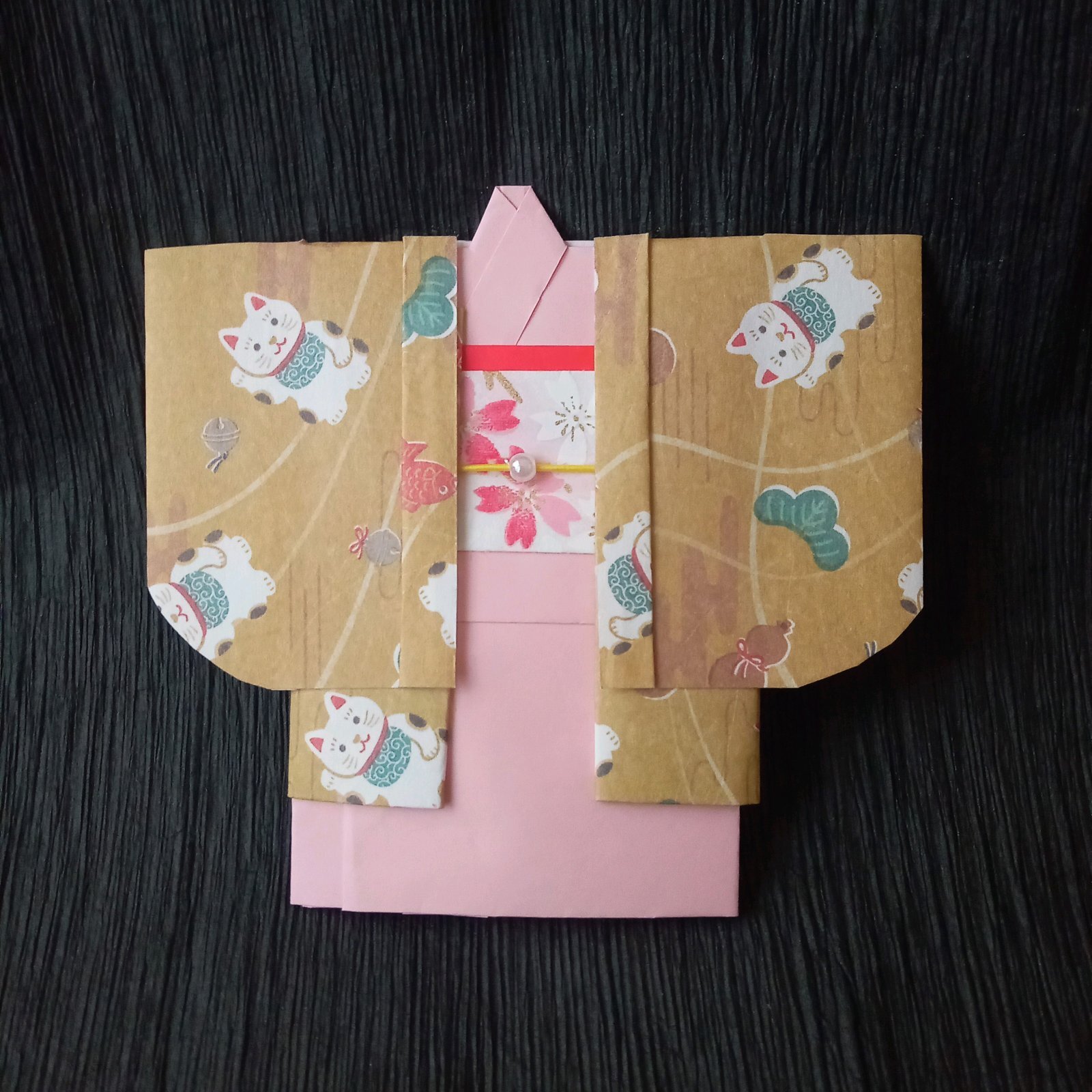 着物の形のポチ袋(半纏)【招き猫 (桃色着物)】
