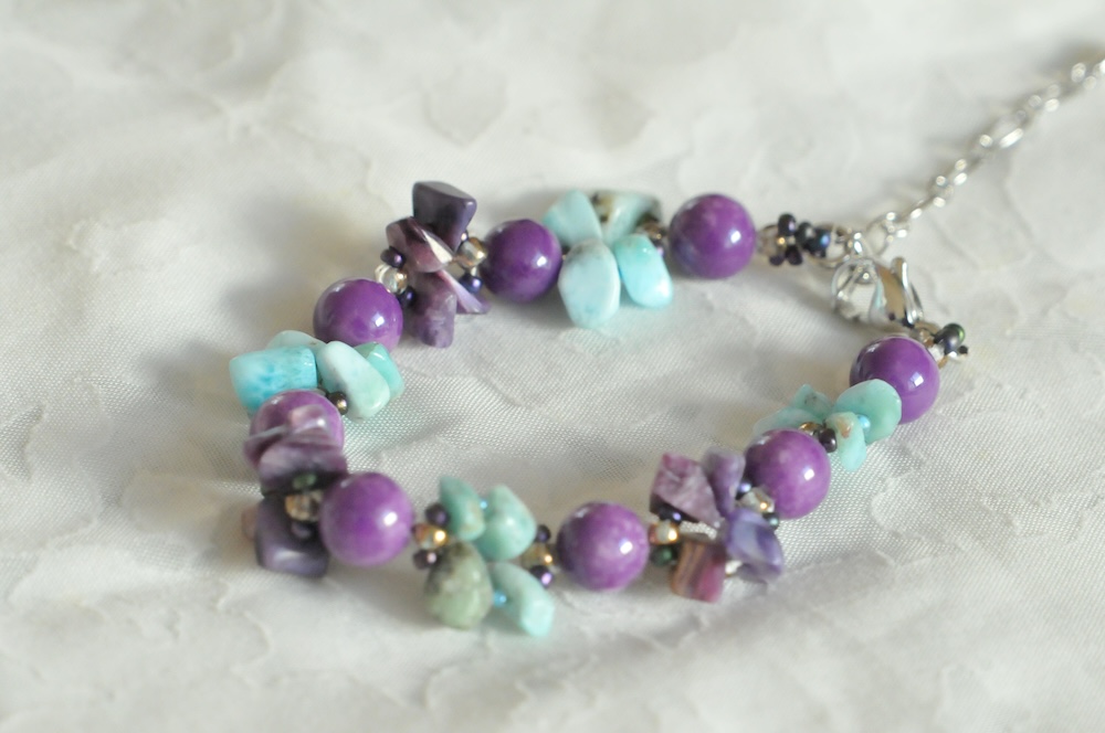 - 天然石ラリマー、チャロアイト、フォスフォシデライト、シードビーズ