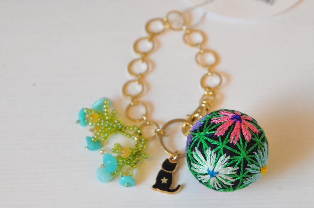 - ビーズ部分はhit-Aが手掛けています。手まりのコスモスの意味は「調和」、同じ意味を持つ天然石アベンチュリンが揺れています。