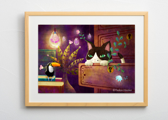 - 額装絵<猫ダンス>「古いタンスの引き出しは、どこかに通じているそうな...」